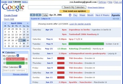 Jetzt hab ich mir endlich mal einen Kalender zugelegt um meine Termine für Zoe und für mich selber zu koordinieren. Ich nutze jetzt Google Calendar. Mit verschiedenen Farben für beide verschiedenen Persönlichkeiten. Das müßte man in Zukunft auch noch öffentlich machen können….