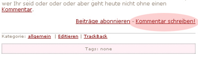 Mensch Mädels und Jungs, ich habe hier etwa 250-300 Besucher am Tag und fast niemand schafft es, meine Kommentierungsfunktion zu benutzen. Das ist nicht nur komisch, sondern vor allem schade, denn ich höre immer nur aus Chats, Emails oder persönlichen Gesprächen, wenn jemand in dieses Blog geschaut hat
