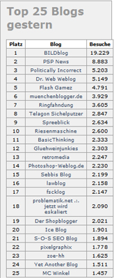 Gestern hat mich Blogscout auf Platz 23 der deutschen Blogcharts gelistet und wenn Blogscout das so sagt, dann ist das so. Somit durfte ich mich wohl gestern als Alphablogger fühlen. 1.625 Visits besuchten damit gestern ziemlich unvorbereitet mein Blog.
