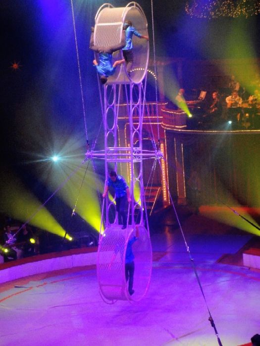 Aber so ziemlich die gesamte zweite Hälfte ließ mich tief beeindruckt werden. Los Nablos beispielsweise, die in und auf einem großen sich schnell drehenden Rad in teilweise schwindelerregenden Höhen turnten. Beeindruckend. Fast beängstigend gut und Andreas Frage, wie man so etwas trainiert, kam mir auch. Die rasanteste und atemberaubendste Nummer.