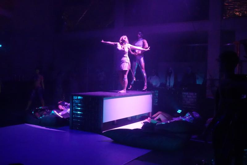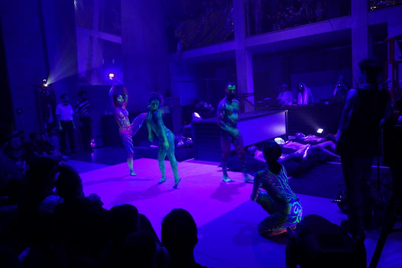In einem Rohbau auf dem Gelände des Kater Blau in einer Halle fanden sich spannende Menschen ein, die offenbar wussten, was dort sei und daher dort hinkamen, statt einem Eintritt eine Spende gaben und sich dann von mit Neonfarbe bemalten Menschen erwartungsfroh an die eine Seite der Halle setzen liessen. Dazu spielten zwei roboterartig gekleidete DJs Musik (nein es war nicht Daft Punk) die ich wohl als irgendwas zwischen House, Elektro und Ambient bezeichnen würde. Irgendwie schon eine seltsame Atmosphäre bei der man direkt still wurde und wusste, hier passiert irgendwas.